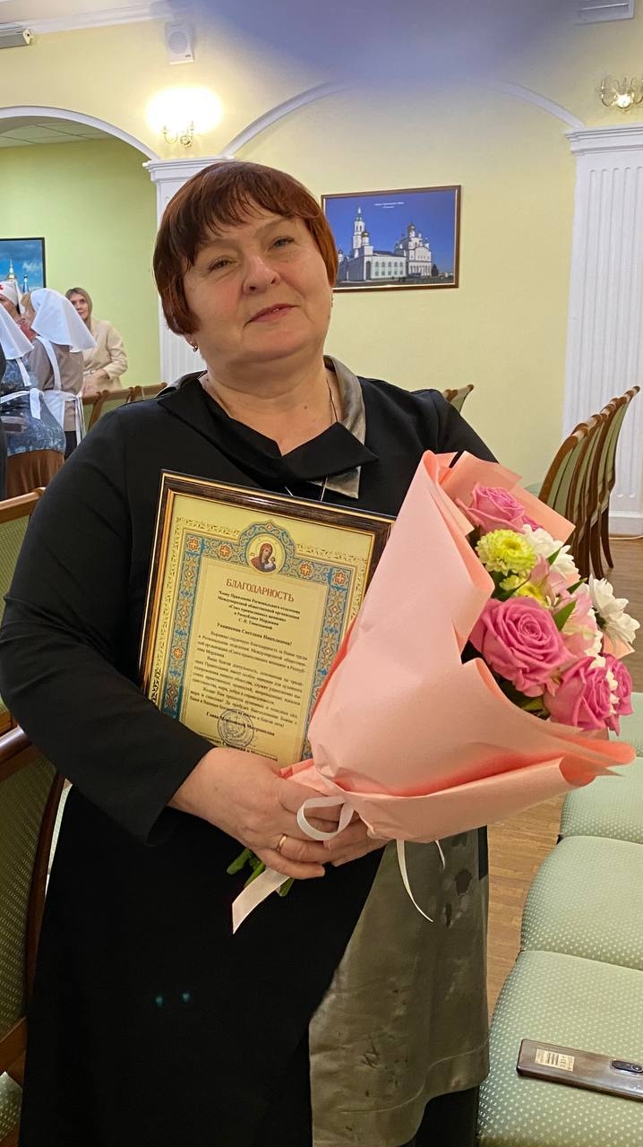 Помощник благочинного по религиозному образованию и катехизации, старший преподаватель воскресной школы храма святых равноапостольных Мефодия и Кирилла, учителей Словенских, г. Саранска Светлана Николаевна Тюменцева отмечена благодарностью Высокопреосвященнейшего Зиновия, митрополита Саранского и Мордовского, за вклад в развитие деятельности регионального отделения организации «Союз православных женщин».